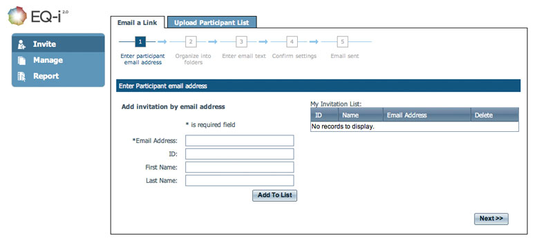 You can invite respondents to take the EQ-i 2.0 directly from your MHS account. To do this, you enter e-mail addresses (either a few at a time or by uploading them as a list), add some identifying information, then customise an e-mail in which they’ll see a unique link to take the EQ-i 2.0 online.