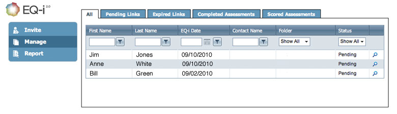 To start using the EQ-i 2.0 or EQ 360 2.0, log in to your EQ-i 2.0 Portal account and click the Assessments tab. Select the EQ-i 2.0 or EQ 360 2.0 and follow the instructions on your screen. Figure 5.1 shows the three options you will see: Invite (to invite respondents), Manage (to manage their records), and Report (to select and create reports).