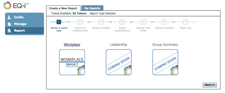 To score and generate a report, log in to your EQ-i 2.0 Portal account, select the EQ-i 2.0 from the Assessment page, and click Report. There, you will have the option of selecting a report type.