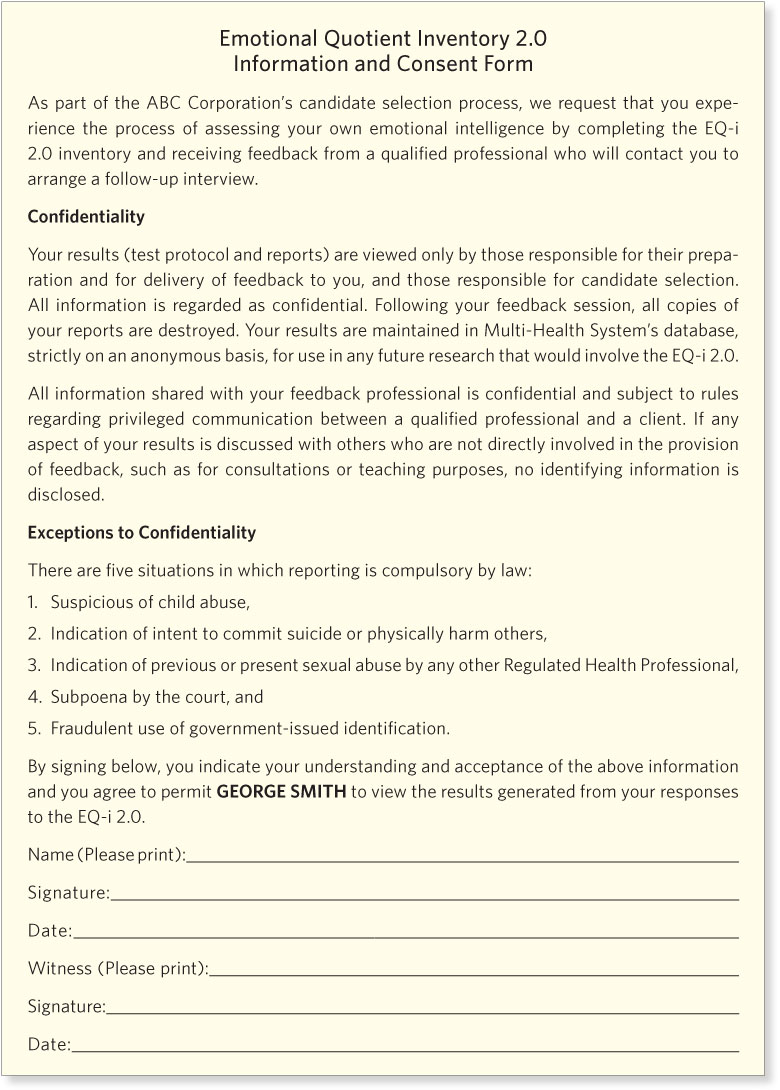 The following section outlines the process for obtaining informed consent. It is not the intention of this section to be all-encompassing or the final authority. It is recommended that any users of the EQ-i 2.0 or EQ 360 2.0 become familiar with the guidelines outlined by their respective national and/or regional governing body (e.g., American Psychological Association, Society for Industrial Organisational Psychologists, etc.).
