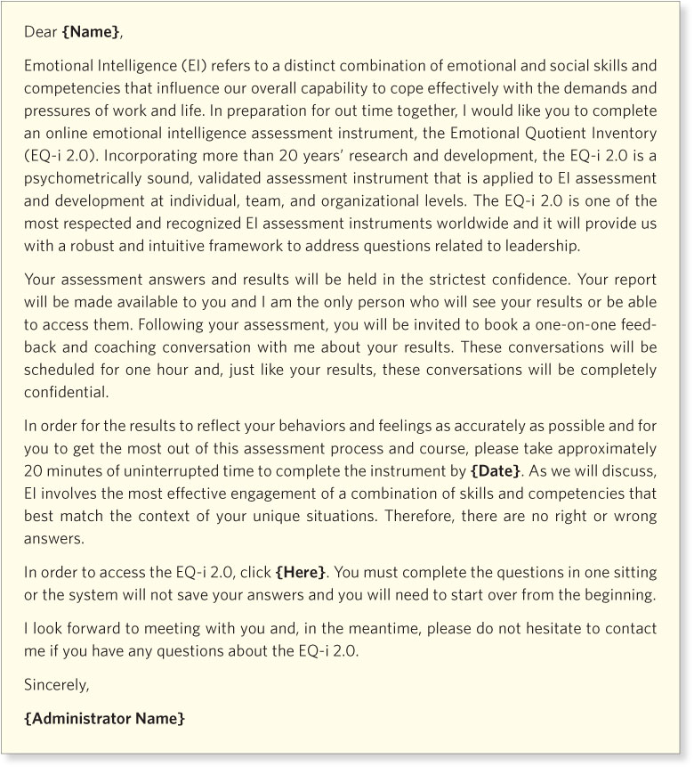 You can create your own invitation to take the EQ-i 2.0 and save it as a template for later use. Your invitation should include the following information: